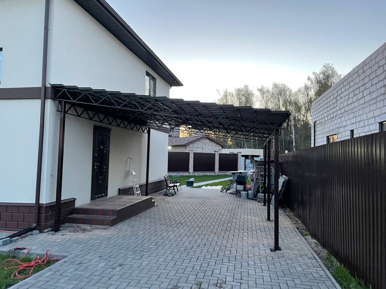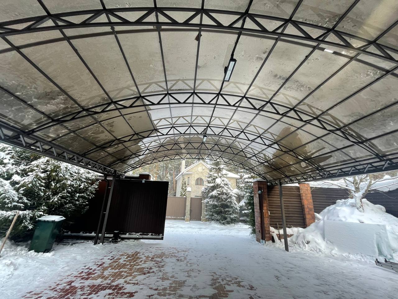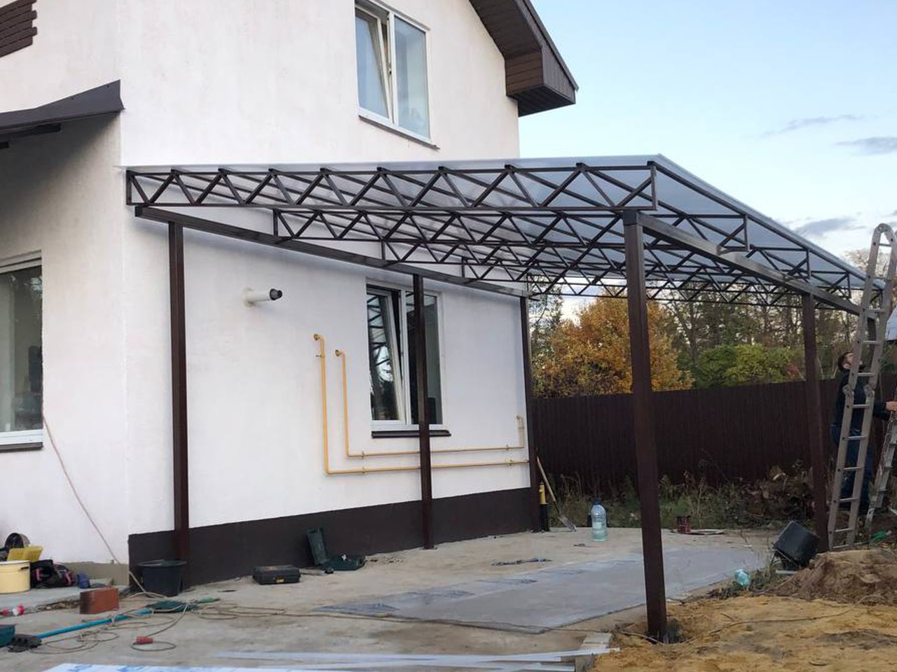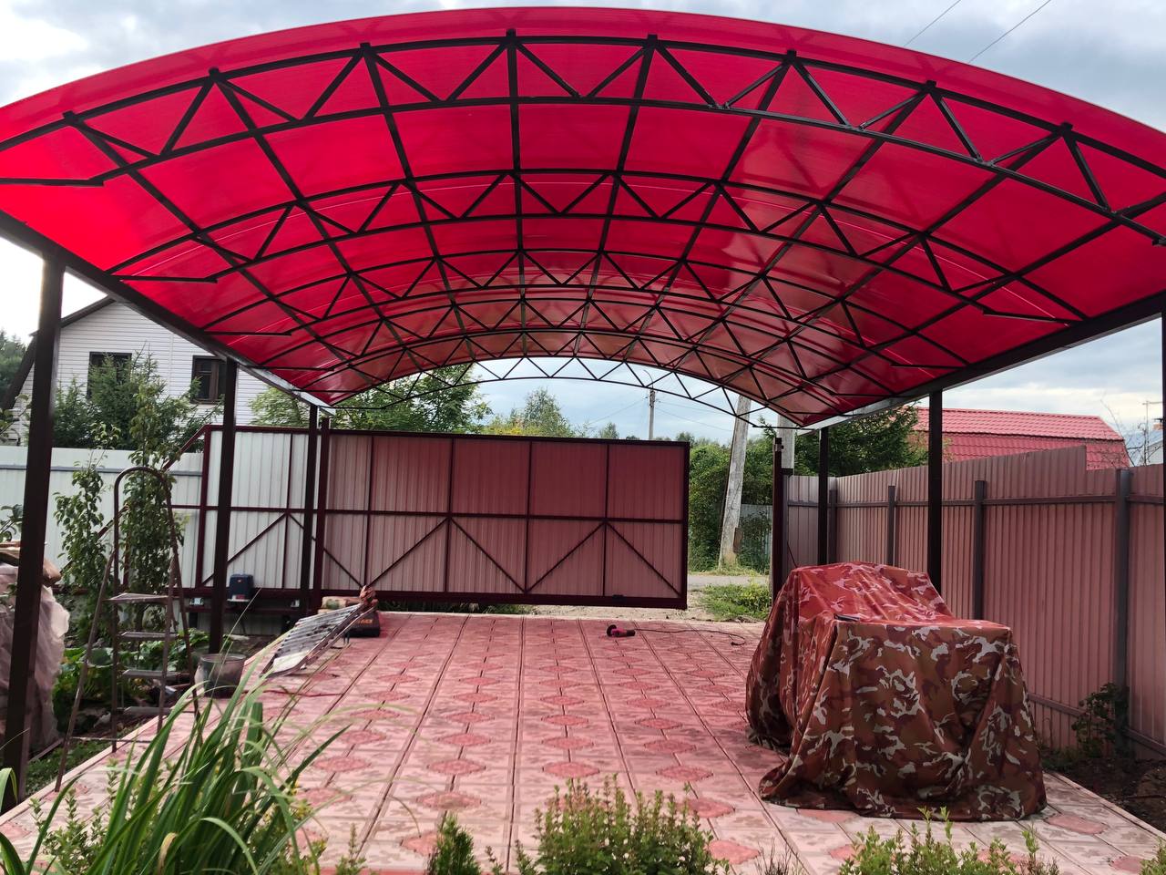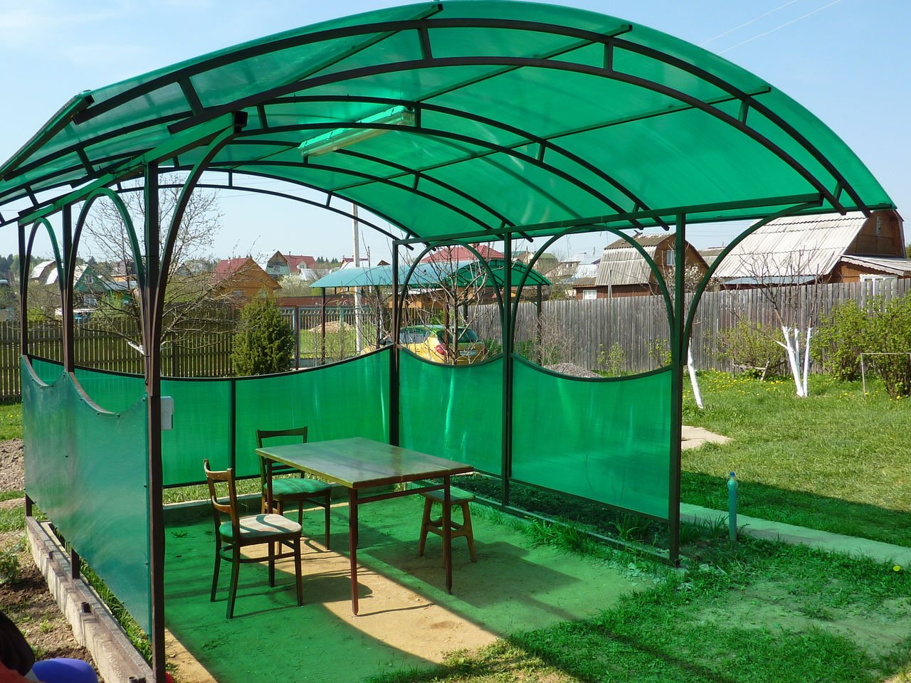За день на даче изготовили арочный навес 5 на 7 с покрытием поликарбоната. Привезли уже готовые крашенные фермы и весь остальной материал. Все за собой убрали и увезли мусор. Молодцы!